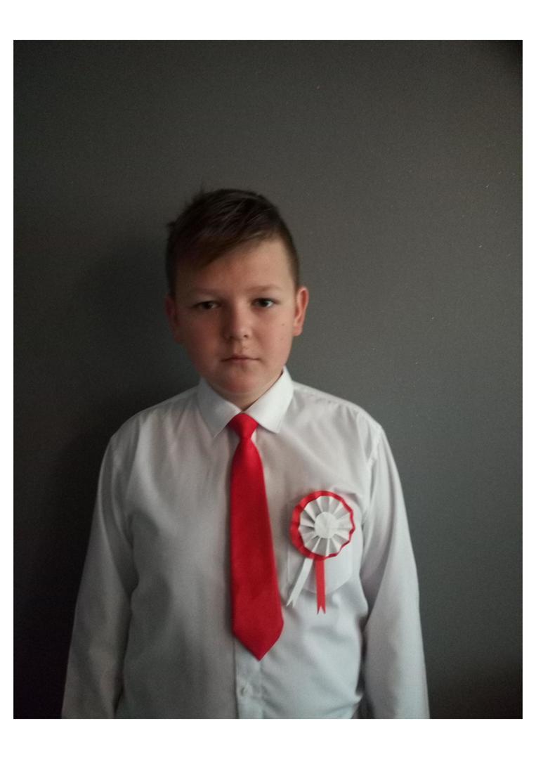 Na zdjęciu uczeń z kotylionem narodowym.