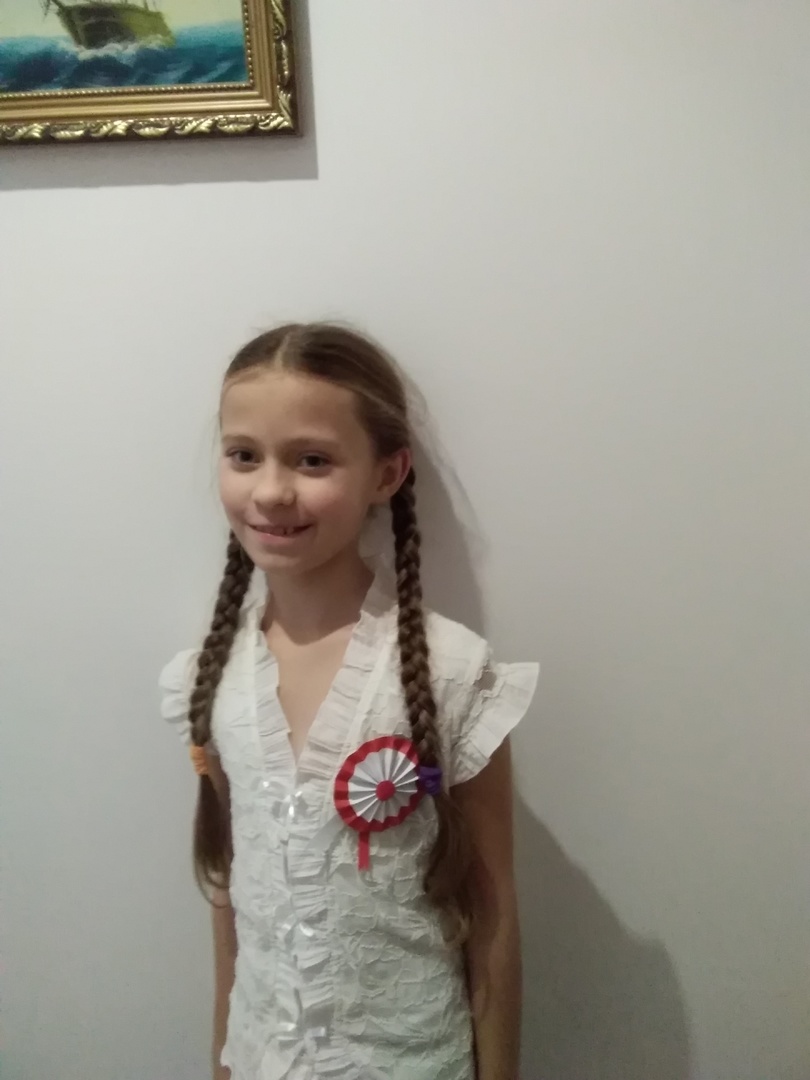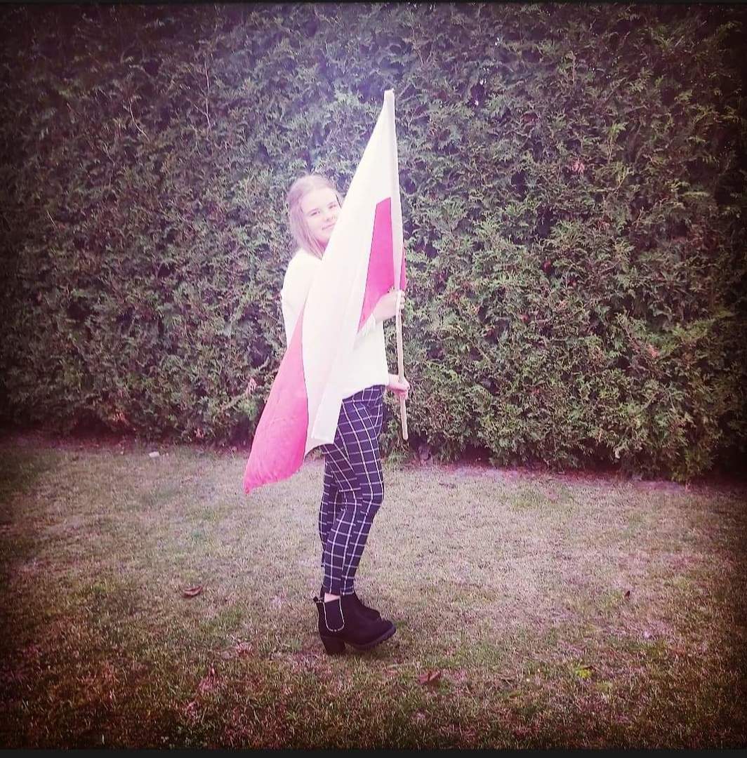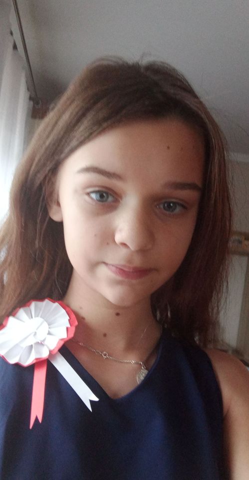 Na zdjęciu uczennica z kotylionem narodowym.