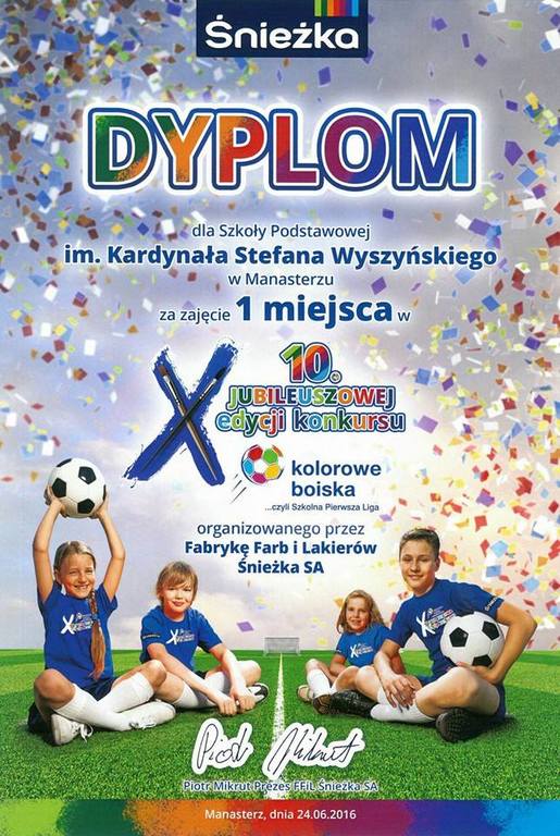 „Od siebie trzeba wymagać najwięcej” to motto Szkoły Podstawowej im. kard. Stefana Wyszyńskiego w Manasterzu, która wygrała dziesiątą, jubileuszową edycję konkursu „Kolorowe Boiska… czyli szkolna pierwsza liga”. Już we wrześniu jej uczniowie rozegrają pierwszy mecz na nowym, wielofunkcyjnym boisku ufundowanym przez pomysłodawcę konkursu – Fabrykę Farb i Lakierów Śnieżka SA.