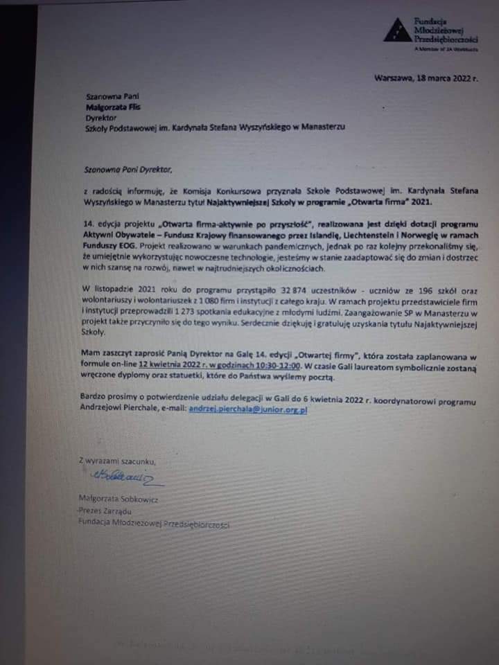 14 edycja projektu ,,OTWARTA FIRMA‐AKTYWNIE PO PRZYSZŁOŚĆ " zakończyła się dla naszej szkoły dużym sukcesem. Otrzymaliśmy tytuł NAJAKTYWNIEJSZEJ SZKOŁY W PROGRAMIE ,,OTWARTA FIRMA 2021 " .Gala finałowa odbędzie się 12.04.2022 r. Brawo MY i zaprzyjaźnione firmy ,które przyczyniły się do naszego sukcesu!